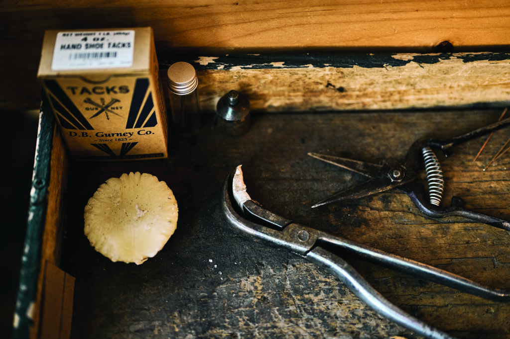 With no one to teach, Dorman turns back to his sewing. He pulls the vamp around a size-8½ wooden dummy foot, known as a last, and hammers metal tacks into the heel and toe, holding it in place. He does the same with the smaller top piece of leather—the plug—so they sit loosely alongside one another. The leather and the last are cozily warm, fresh out of a makeshift toaster-oven/heat-lamp rig that Peter calls his hot box. He punctures the vamp and plug together in one smooth motion with his diamond awl, then slips two needles through the newly made holes in tandem, in opposite directions, and pulls the threads tight, raising his arms wide. As the waxed thread zips through the firm leather and goes taut, it’s satisfyingly audible from yards away, even as the heel laster’s air compressor goes full bore.
