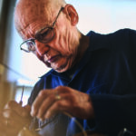 Here is Peter Dorman, 87 years old, still standing. He sews moccasin-style shoes in Lewiston, 40 hours every week, earning $20 an hour. He doesn’t get sore anymore, he swears. “After doing it for 60 years? My muscles are pretty well trained,” chuckles Dorman. Callouses tell the story of his work: the tops of his middle and ring fingers are scuffed and bright, like freshly sanded pine furniture. The sides of his pinky fingers bear deep notches where he uses them to pull his threads taut, carrying the tension across his hands lest the stress break his needles.