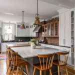 Inspired by images of marble waterfall countertops, Jen got an idea for a butcher-block waterfall island that would slide over the entry to the spiral staircase. It’s not quite a trap door, but it has a similar effect. Not only did this funky fix expand the usable portion of the kitchen, but it also visually connected the fragmented space. It wasn’t an easy task to complete. Before carpenter Rick Smith first visited, he wasn’t even sure he wanted to take the job, Jen recalls. “He was going to give us someone else’s name,” she says. “But he walked through and said, ‘Someone else is going to mess this up. The floors are all crooked.’ Out of nowhere, he said he’d do it.” Greg and Jen didn’t want seams in the wood, so Smith, using a block and tackle, hoisted the five-by-six-foot slab through the first and second floor stairwell and into the kitchen. To make the area look more cohesive, the couple brought the warm tones of cherrywood and brass to the forefront against a backdrop of blue and white cabinetry and gray marble, black soapstone, and gray quartzite. They brought in dining stools from Chilton Furniture to lend a bit of vintage charm to the room. “We both grew up in old or classic-style houses,” says Greg. “That’s why I love visiting Europe: the architecture. We both really appreciate the craft that goes into older houses.”