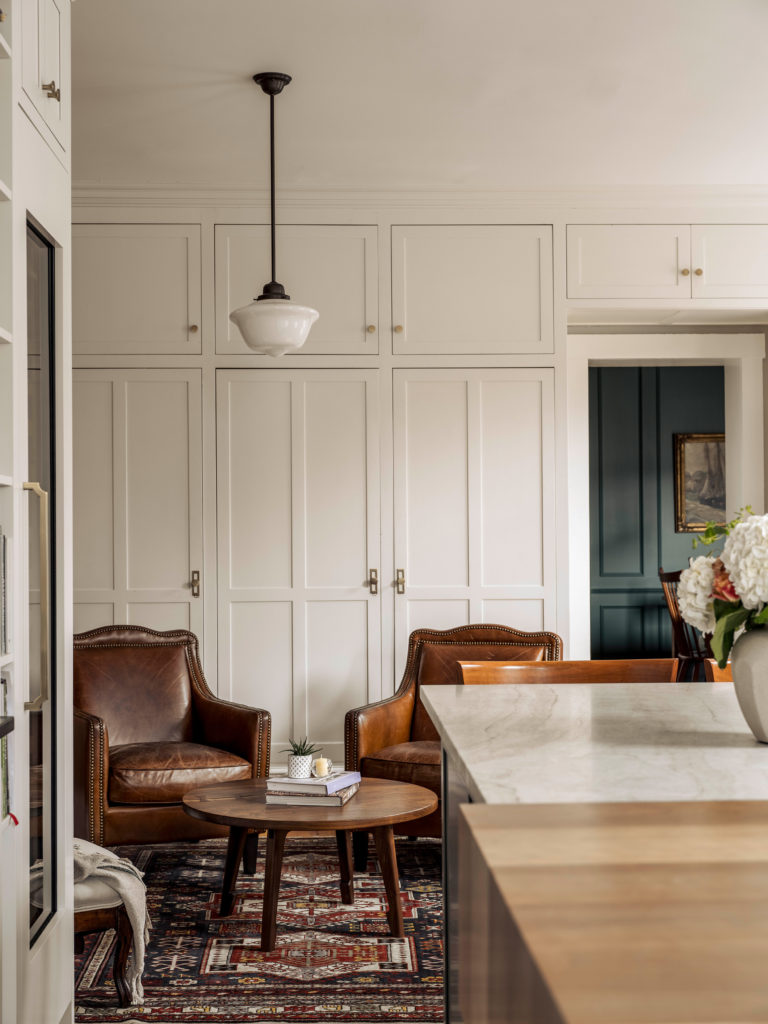 To honor the age of their new place (it was built in the 1860s) and the couple’s shared tastes, they opted not to knock down walls or go the open-concept route. “We really like that each room feels like its own distinct space,” says Jen. In the dining room, Smith was tasked with replicating the existing mouldings and extending them. The couple commissioned a local furniture maker, Alex Donatelle, to create a cherrywood sideboard by wainscotting the walls with wood paneling, and selected brass lamps to cast a soft glow that mimics candlelight. “Before, it was a perfectly nice room, but it fell flat,” says Greg. “I had this idea of trying to evoke the warmth and feeling of congeniality you find in old European ski chateaus.” There was one in particular that he had in mind: Hospiz Alm in St. Cristoph, Austria. Jen was on board, but she did have one major suggestion. “I had saved this color green on Pinterest maybe ten years ago,” she says. “I loved that green. I showed it to Greg, and he did, too.” After purchasing eight or nine samples of paint, they found a match: Verdigris by Benjamin Moore. “With so much in homebuilding, you try to find a close-enough match,” Greg reflects. “But with this green, in this room, I think we nailed it.”