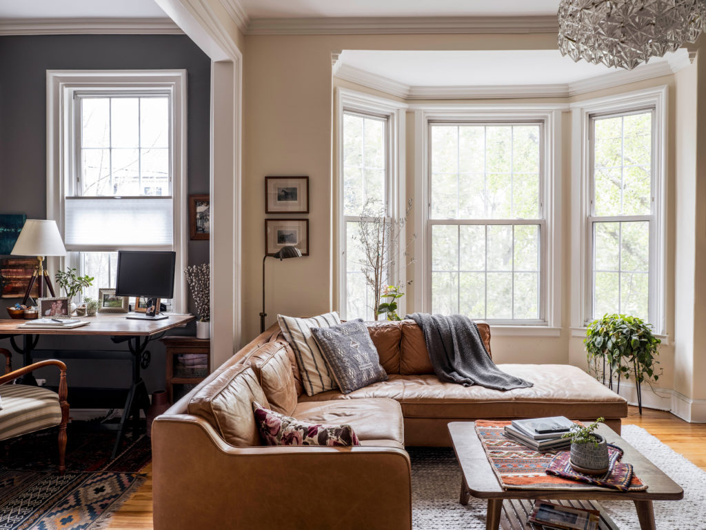 They’re also happy with how the living room turned out, with a fresh coat of white paint, a warm Oriental rug, and a smattering of inherited antiques, including a cabinet made by Jen’s grandfather and a drafting table that once belonged to her grandmother. “She was an artist, and that piece is really special to me,” she says. “I use it as my desk.” Like her parents and grandparents before her, Jen tends to cart around antiques that she likes from house to house, waiting for the right space to place them. One, an old window with original glass panes, got installed in an interior wall to pull light from the east-facing living room into the dark hallway. “It now gets that nice morning light,” she says.