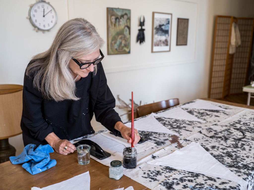 When it comes to translating her poems into physical items of clothing, the materials that Fisher chooses are of the utmost importance. In traditional clothing design, the fabric used in a garment is dictated by its function (a stiffer material will be used for an article of work clothing like overalls, while a soft batting might be used in a jacket intended for cold-weather use). For Fisher, this principle is enhanced; the chosen material also reflects the meaning of the poem that the garment derives from. If the poem is about flight or the feeling of weightlessness, for example, the garment will be made from a light, airy material. Fisher also frequently incorporates specific items into each piece to get to the essence of the poem, such as the hand-painted panel in the Junco top, which depicts tiny bird tracks; the cloth book that comes in the pocket of the In Libris tunic; and the custom-made paintbrush that accompanies the Brush duster jacket.